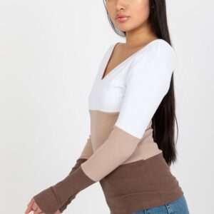 Bluzka z długim rękawem oraz dekoltem w serek. Bluzka wykonana z prążkowanej tkaniny w trzech kolorach.
