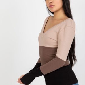 Bluzka z długim rękawem oraz dekoltem w serek. Bluzka wykonana z prążkowanej tkaniny w trzech kolorach.
