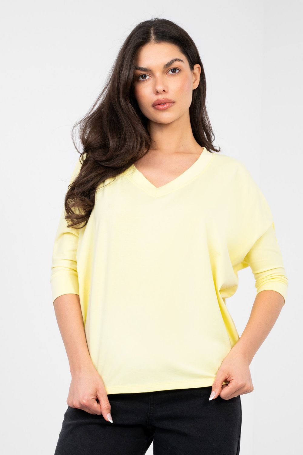 Uniwersalna bluzka codzienna o ponadczasowym, gładkim wzorze, która doskonale sprawdzi się w każdej garderobie. Wykonana z wysokiej jakości bawełny z dodatkiem elastanu, jest miękka, przewiewna i przyjemna dla skóry, a jednocześnie delikatnie elastyczna, dzięki czemu zapewnia swobodę ruchów i komfort przez cały dzień. Model o standardowej długości z rękawem 3/4 to praktyczne rozwiązanie na każdą porę roku. Klasyczny dekolt w serek subtelnie podkreśla szyję i nadaje całości kobiecego charakteru. Brak zapięcia sprawia, że bluzka jest wygodna w zakładaniu i ma minimalistyczny, estetyczny wygląd.