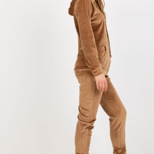 Komplet welurowy składający się z bluzy i długich spodni. Bluza z długim rękawem oraz kapturem, zapinana na zamek. Na przodzie kieszenie wsuwane. Długie spodnie z wiązaniem w pasie, po bokach kieszenie wsuwane.